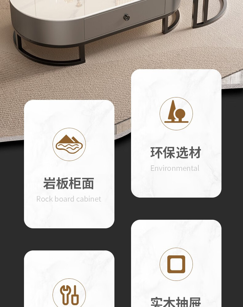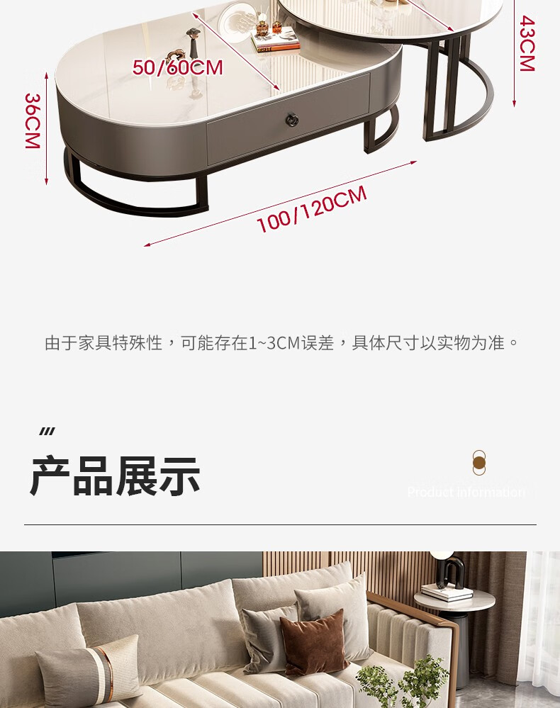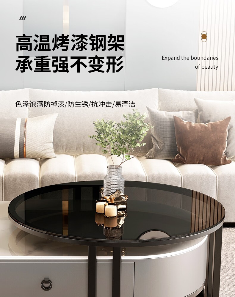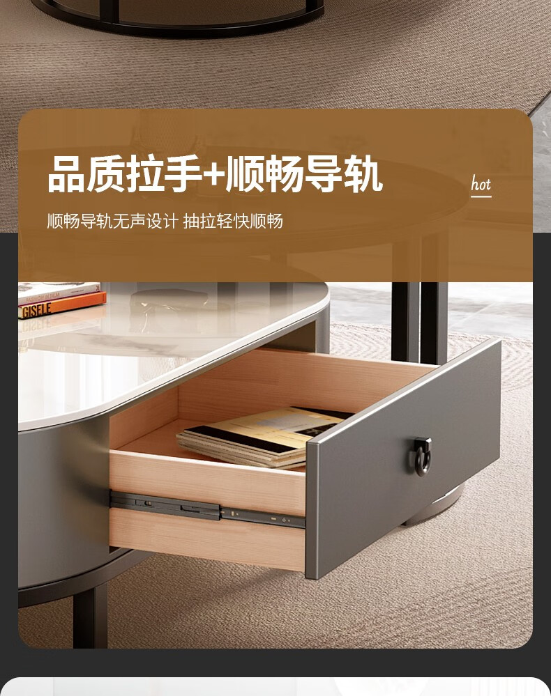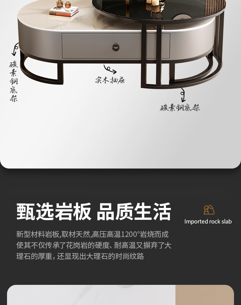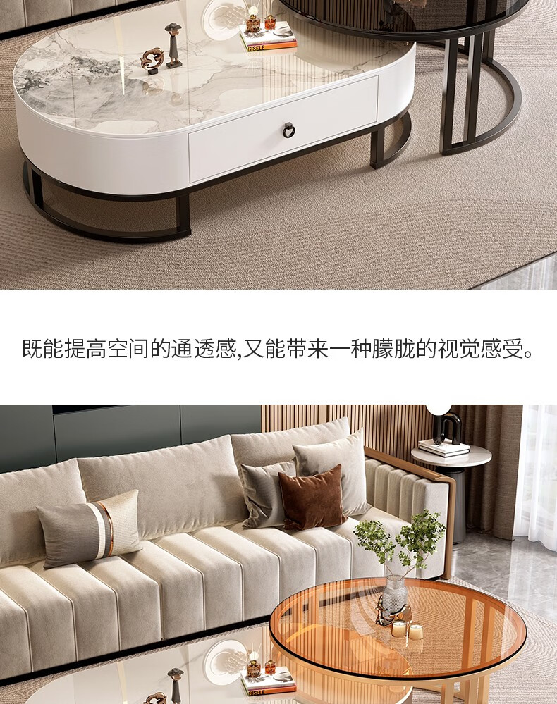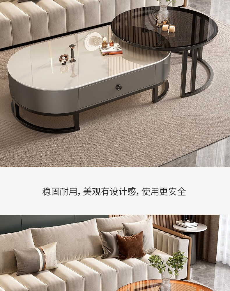 岩板茶几客厅小户型简约轻奢椭圆形可伸缩茶桌 C14-1黑架灰箱 雪山白+黑玻 120cm椭圆茶几+80cm小圆边几